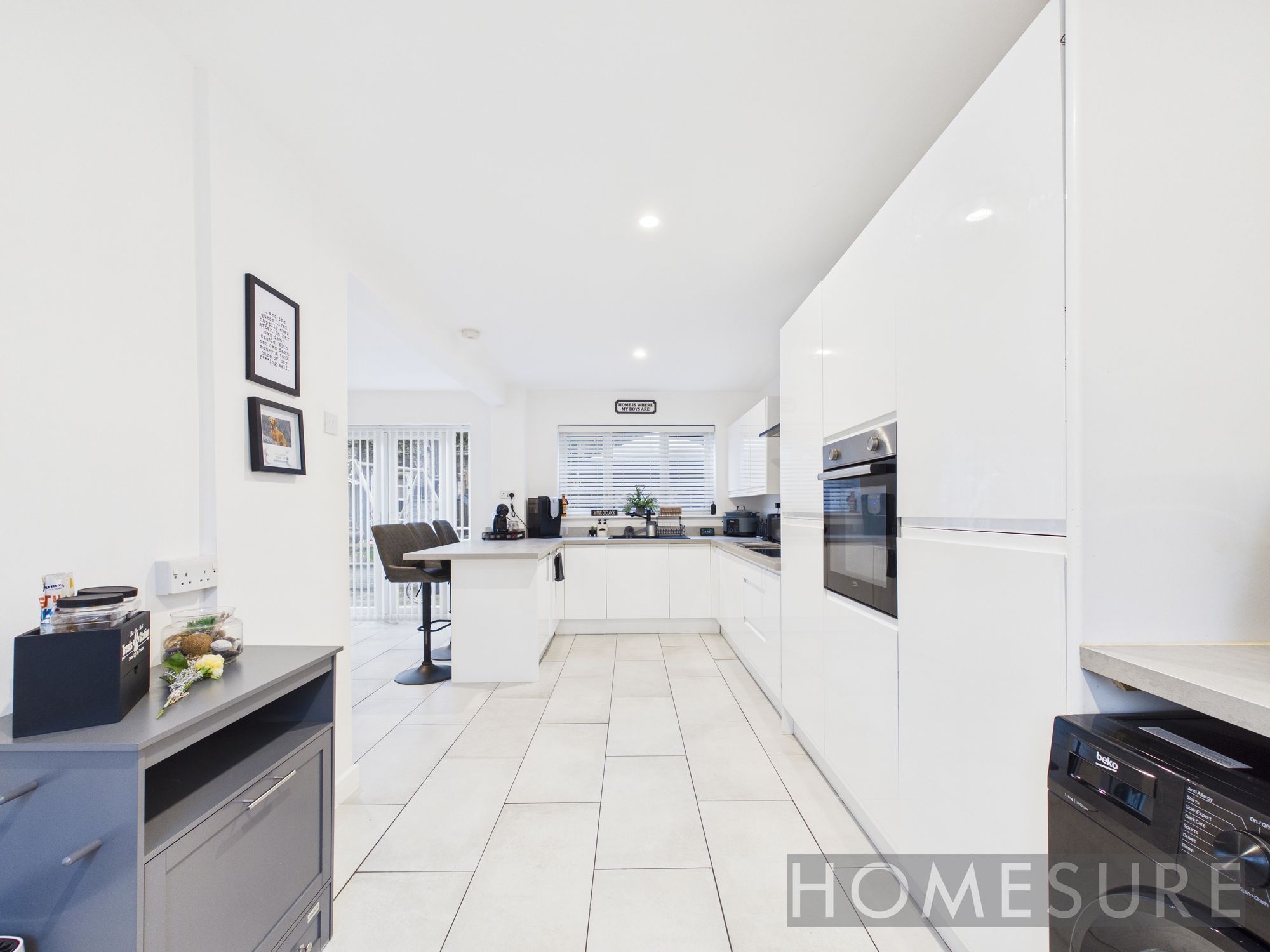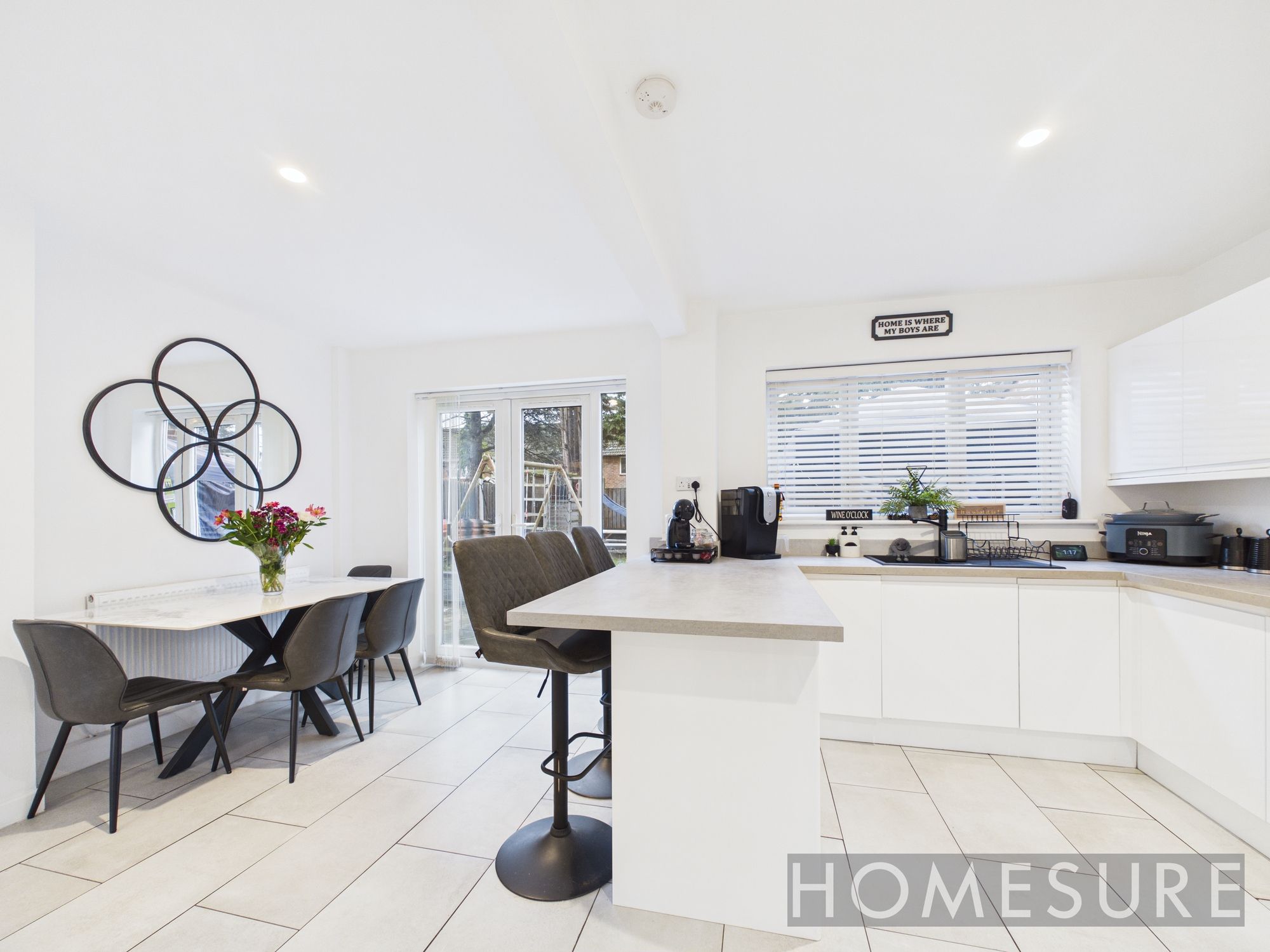 The heart of the home is the modern and spacious kitchen, thoughtfully designed with integrated appliances and a convenient breakfast bar, providing the perfect space for both every-day living and entertaining guests. French doors from the kitchen offer seamless access to the patio and garden, further enhancing the sense of openness and flow within the property.