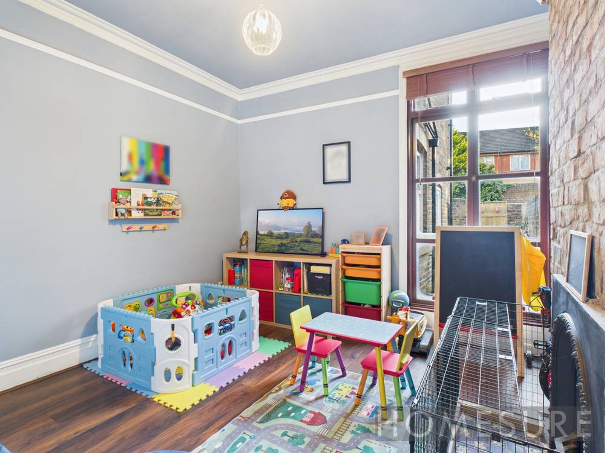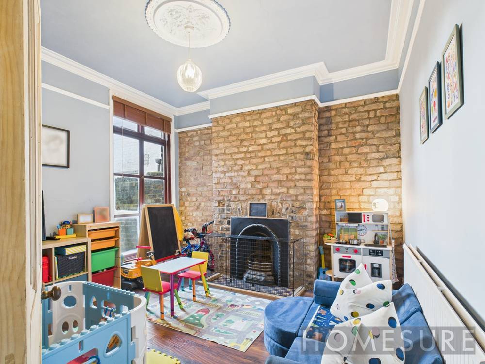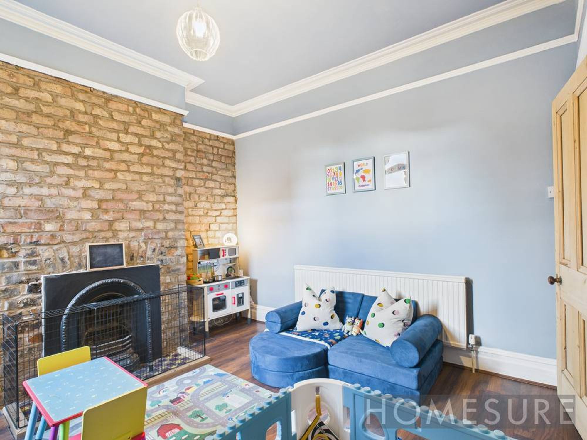 This beautifully presented four-bedroom, one-bathroom mid-terraced house offers generous family living across three versatile reception rooms, all brimming with character and modern comfort. Upon arrival, the classic red brick façade, striking blue front door, and elegant bay windows create an inviting first impression, complemented by a neatly maintained front garden.