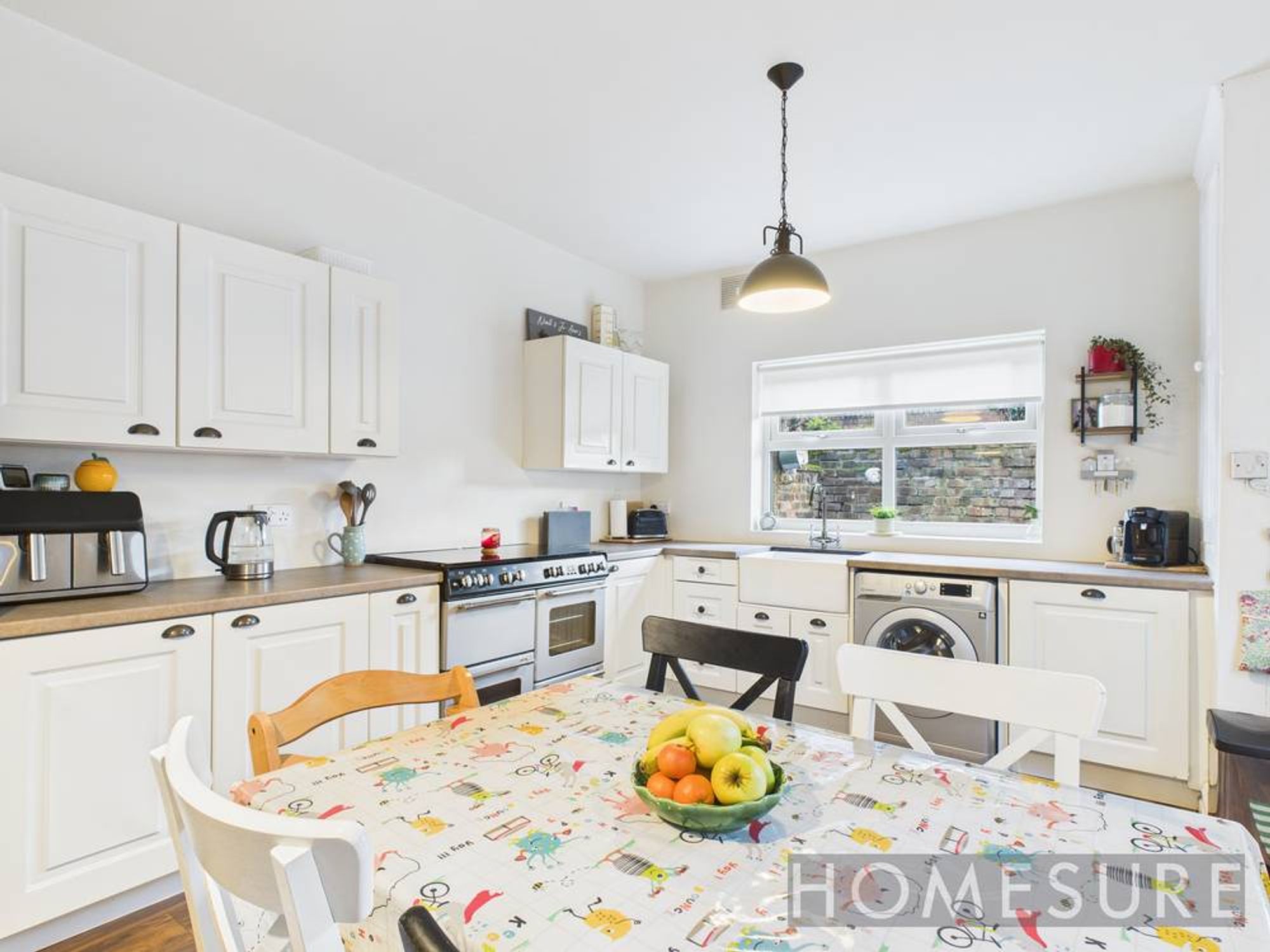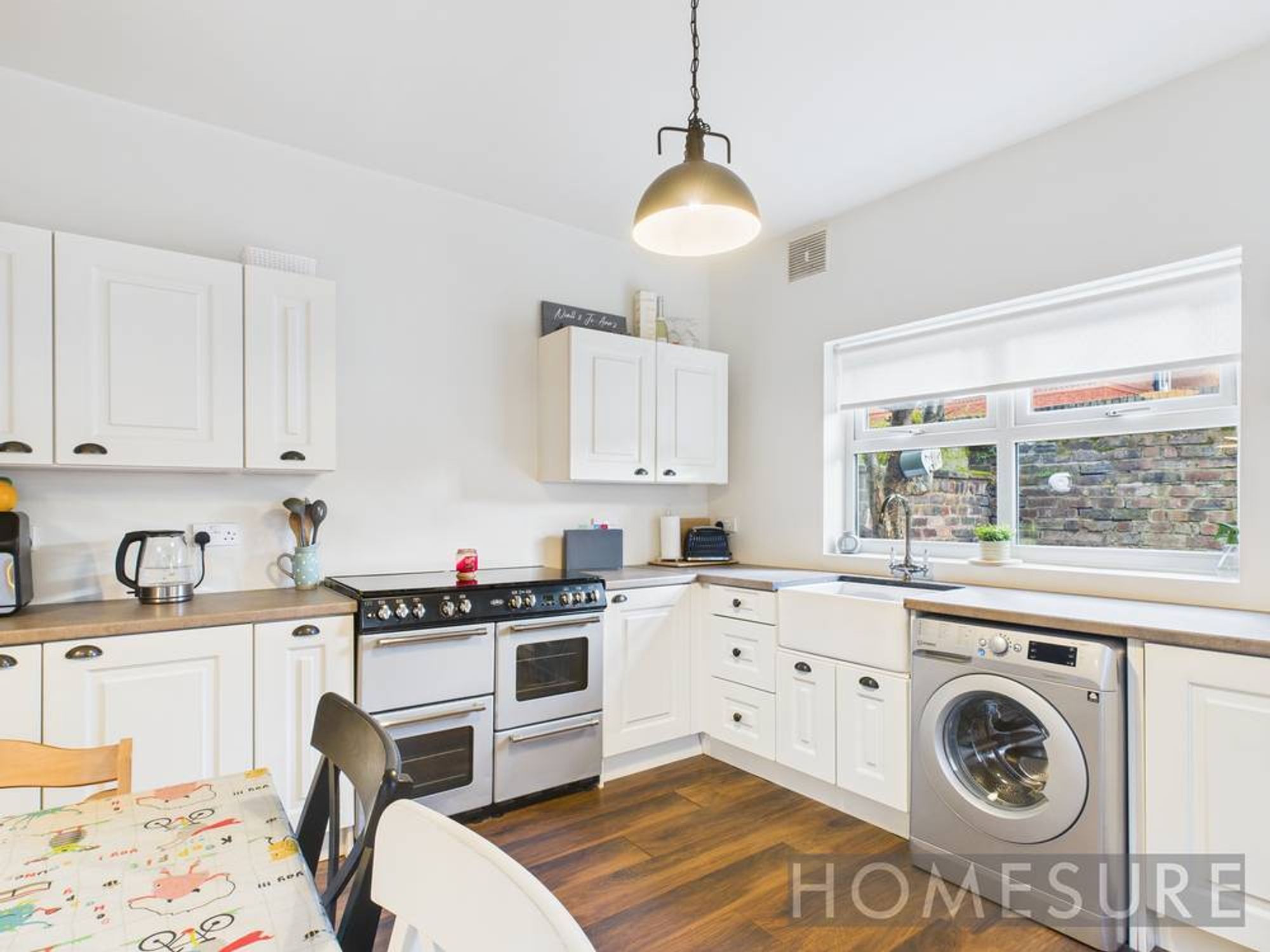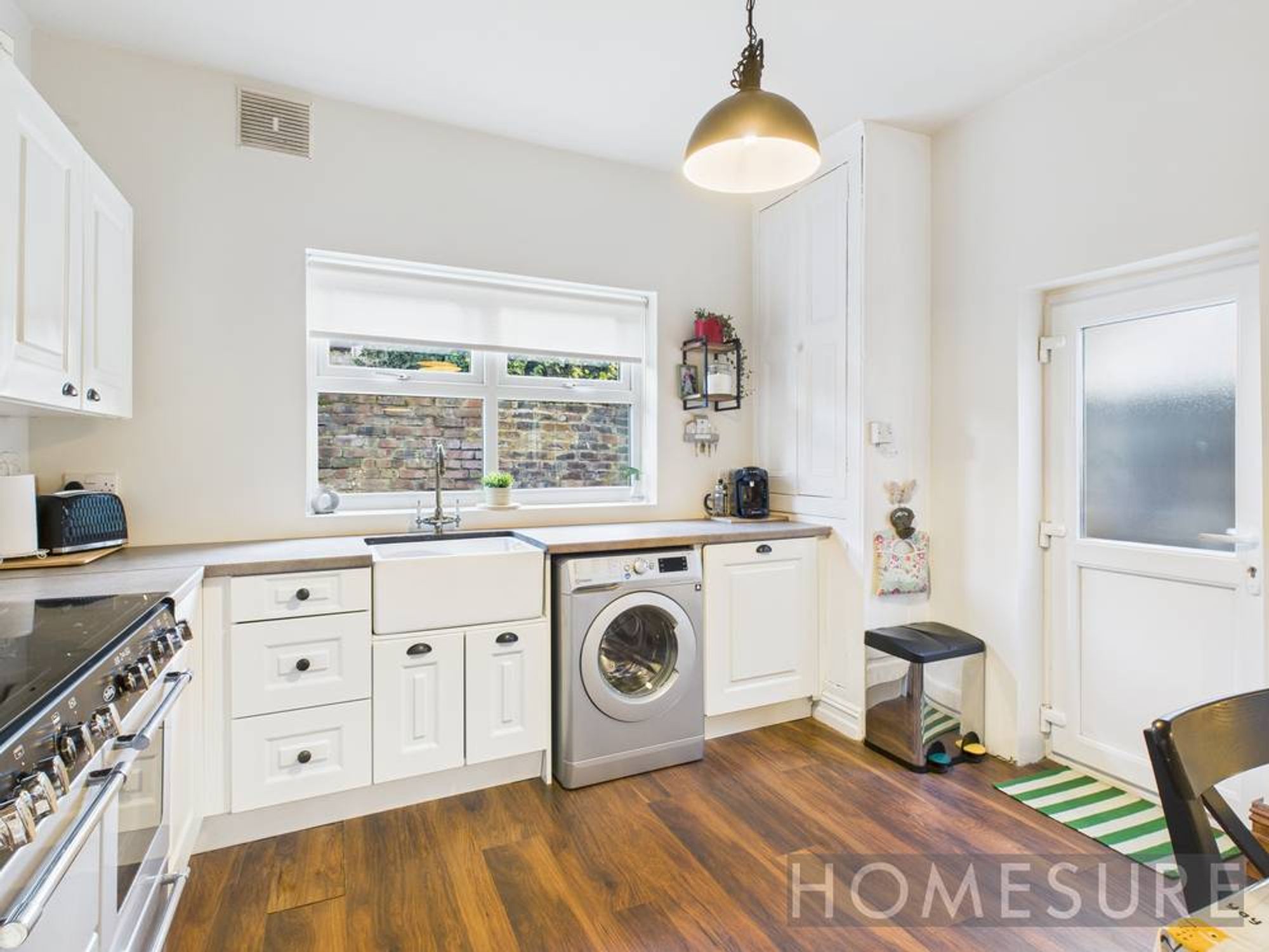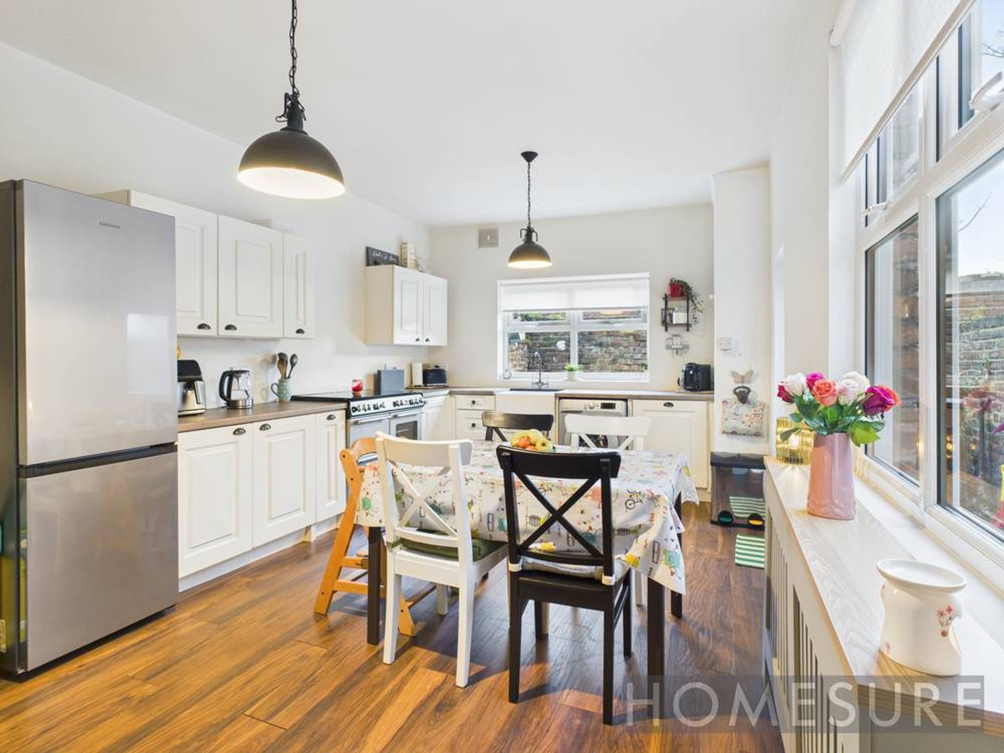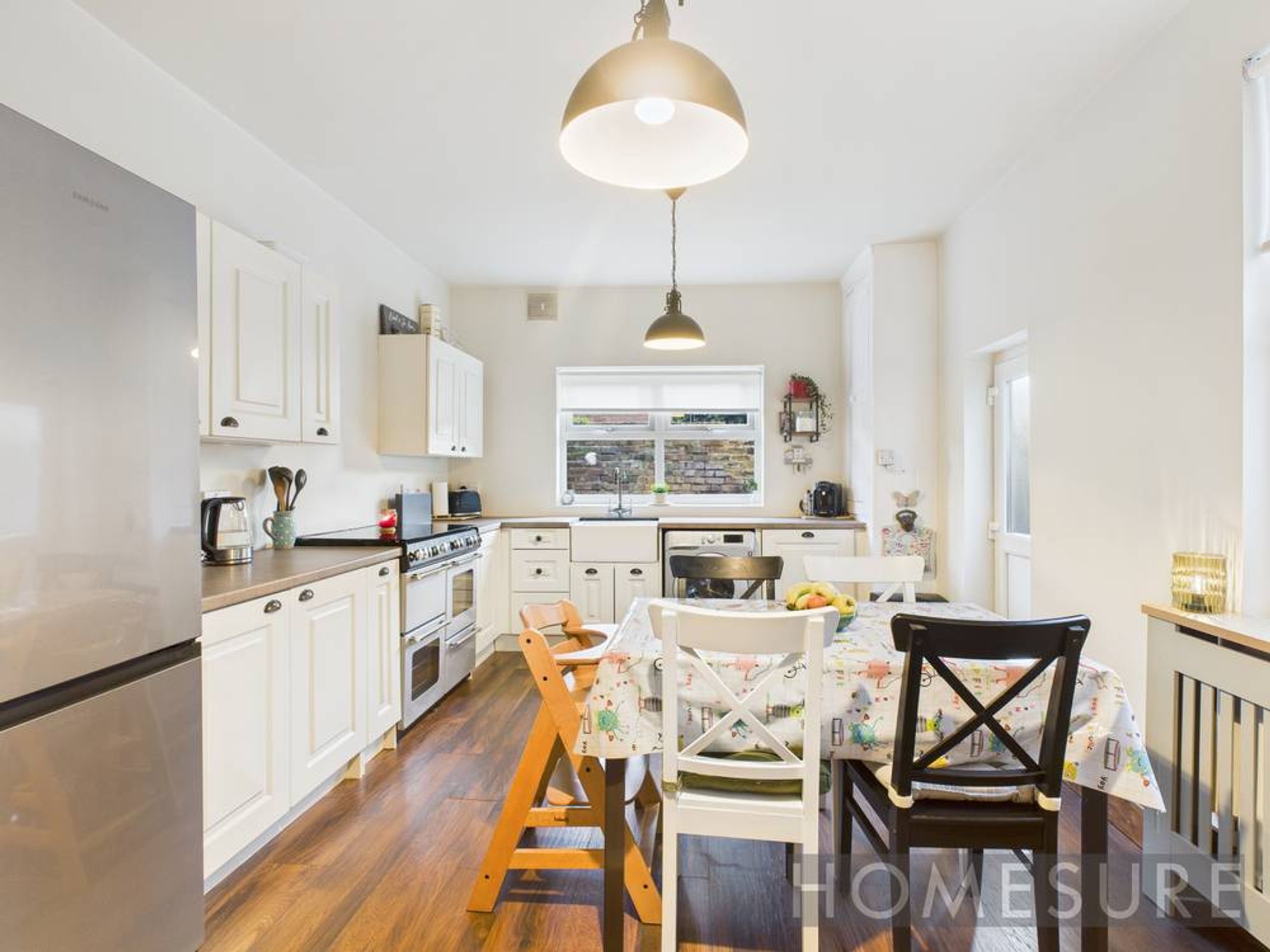 At the heart of the home, a modern open plan kitchen and dining area boasts sleek white cabinetry, integrated appliances, a stylish farmhouse sink, and rich wood flooring, all illuminated by abundant natural light. The well-designed space easily accommodates family meals and entertaining, with direct access to the private garden for seamless indoor-outdoor living. The property’s well-maintained, enclosed garden features a private patio, secure outdoor storage, and child-friendly play areas – ideal for families seeking a safe and low-maintenance outdoor retreat.