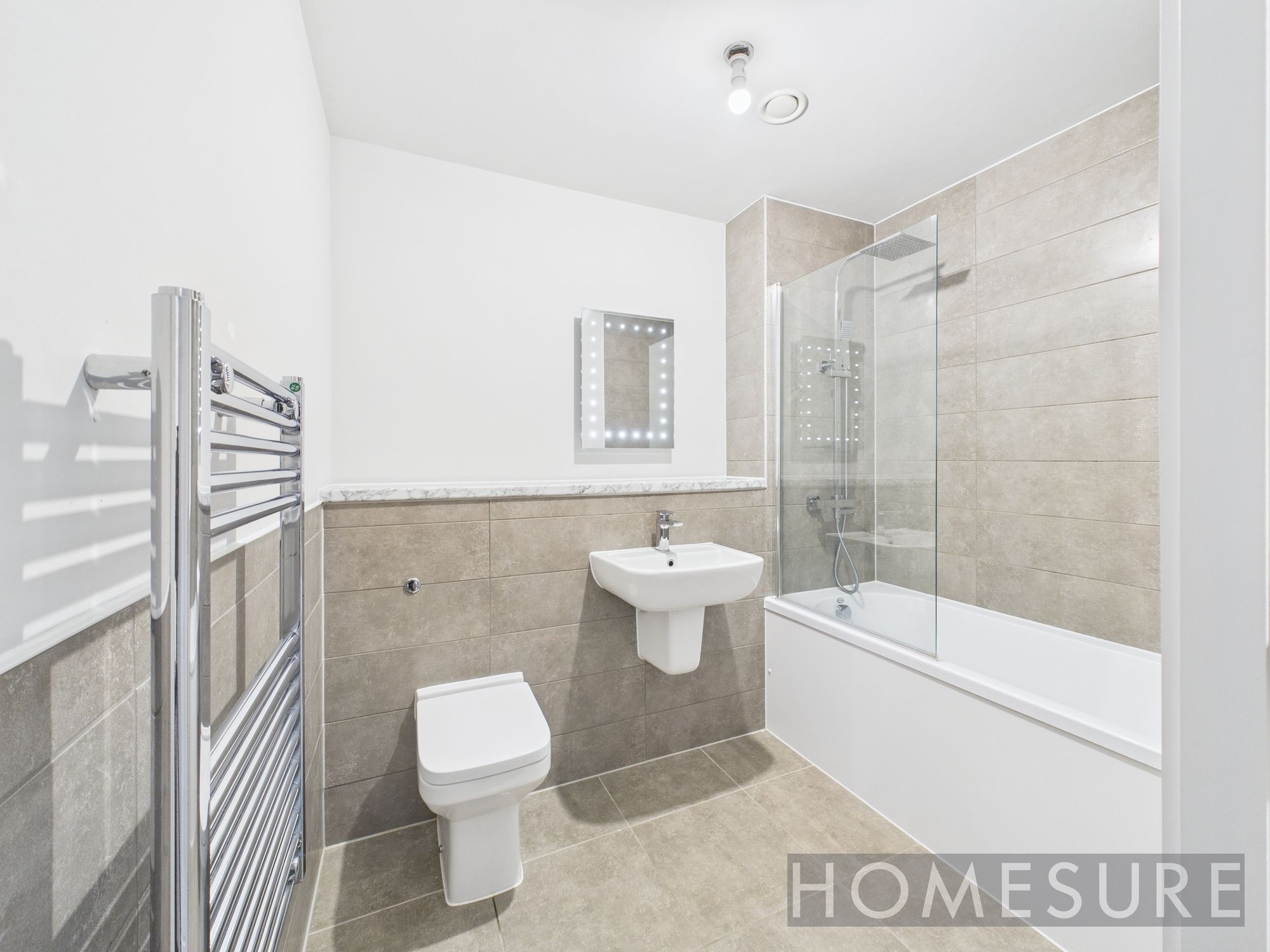 Both bedrooms are generously sized, featuring plush carpeting for comfort. The modern bathroom showcases a shower, bath-tub, heated towel rail, and an elegant LED mirror, providing a luxurious and functional space. Additional highlights include a welcoming hallway with built-in storage, and access to beautifully landscaped communal gardens and paved walkways, offering a tranquil outdoor retreat. This flat perfectly balances comfort, style, and practicality, making it an exceptional choice for those seeking an urban lifestyle.